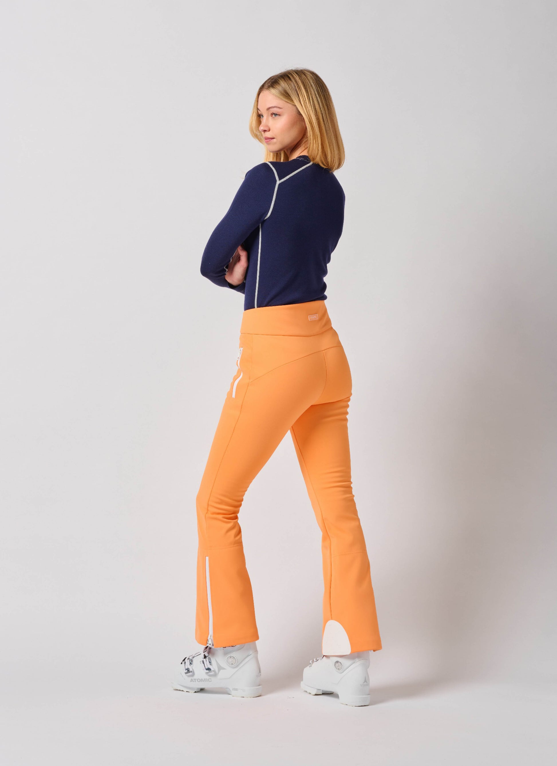 The Lennon softshell pant is our take on the perfect pant to ski in style. The pant is high-waisted, fleece-lined, and has triple-layered, four-way stretch softshell to accommodate all winter activities from double black diamonds to après ski. The silhouette of the pant was carefully designed for slim fit with a flare at the bottom hem. We have custom boot gaiters to protect from snow inside pant, along with a DWR-Free water repellent finish on the exterior of the garment. Style with our Poppy ski jacket to create a matching set.
