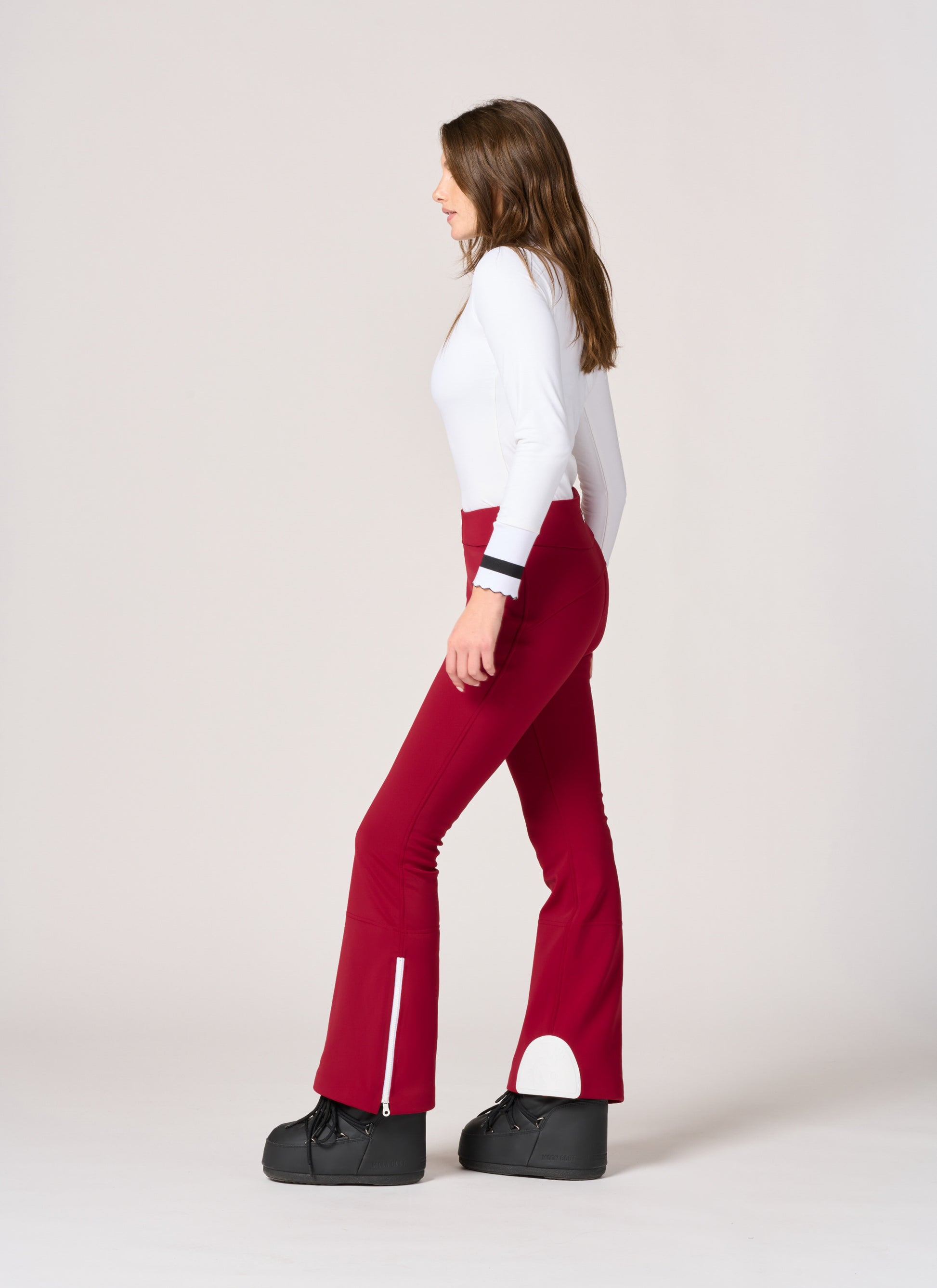 The Lennon softshell pant is our take on the perfect pant to ski in style. The pant is high-waisted, fleece-lined, and has triple-layered, four-way stretch softshell to accommodate all winter activities from double black diamonds to après ski. The silhouette of the pant was carefully designed for slim fit with a flare at the bottom hem. We have custom boot gaiters to protect from snow inside pant, along with a DWR-Free water repellent finish on the exterior of the garment. Style with our Poppy ski jacket to create a matching set.